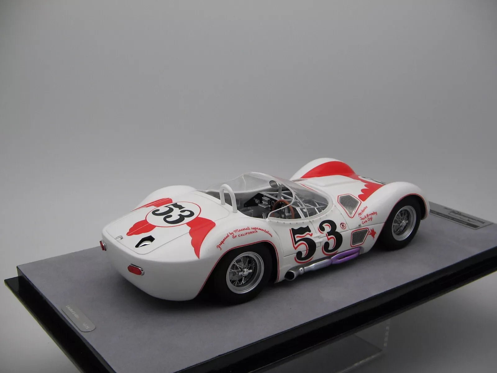 Experience the legendary Maserati Birdcage Tipo 61, the 1960 at Riverside "Time GP" with Bill Krause triumphed at the wheel. This model was made to the usual high standard Tecnomodel quality manufactured and perfectly reflects the original. With its attention to detail and exceptional workmanship, it is a real one Collectible for every motorsport fan.